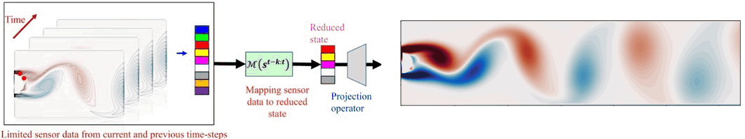 State estimation problems are one of the paramount application areas, that is well-established in fluid mechanics, and is often used in the applied subjects of design optimization and active flow control. In this work we try to leverage reduced order models (ROMs) as an effecient mediator to protect loss of information and a computational cheaper alternative. In this work, we proposed a novel deep learning-based state estimation framework that learns from sequential sensory data placed around the circumference of the 2D cylinder. A feedforward neural network based auto-encoder was used as an ROM to project high-dimensional space to the low-order manifold where LSTMs are used for the teacher-forced evolution of the low-order manifold taking sequential sensory data as input. More details about this work can be found [here].