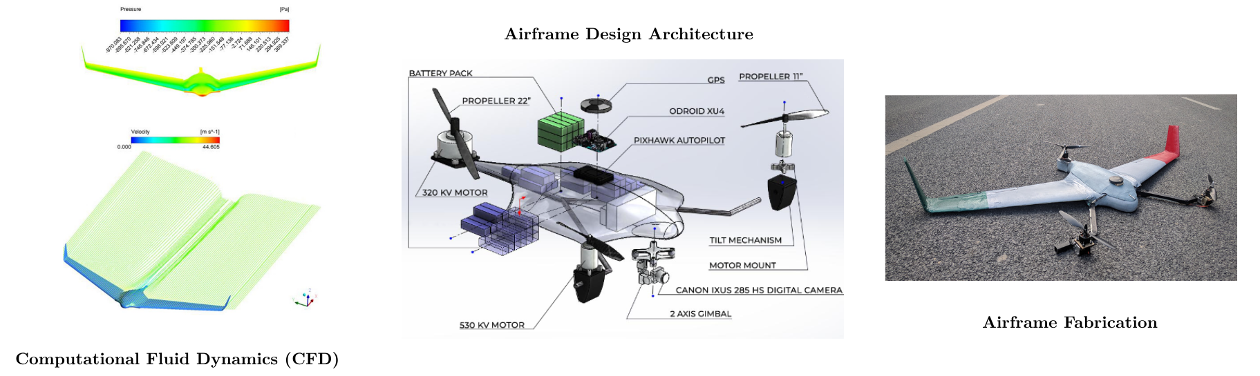 Fabricated state-of-the-art, all-composite, Vertical Take Off and Landing Unmanned aerial vehicle (VTOL-UAV) with automatic tilt rotor mechanism using Vacuum Bagging process for HADR missions (Mehar Baba Prize competition). Improved the aerodynamic efficiency (Lift/Drag Ratio) of VTOL-UAV by introducing C-curve wing-lets by 10%, thereby enhancing the crashworthiness of the system. Developed the 3D CAD model of the UAV and tilt rotor mechanism on Solidworks. Carried out 3D CFD Simulations using K-omega turbulence model to evaluate the Coefficient of lift and drag of the VTOL-UAV. Numerical experiments were performed on ANSYS Fluent and OpenFOAM.